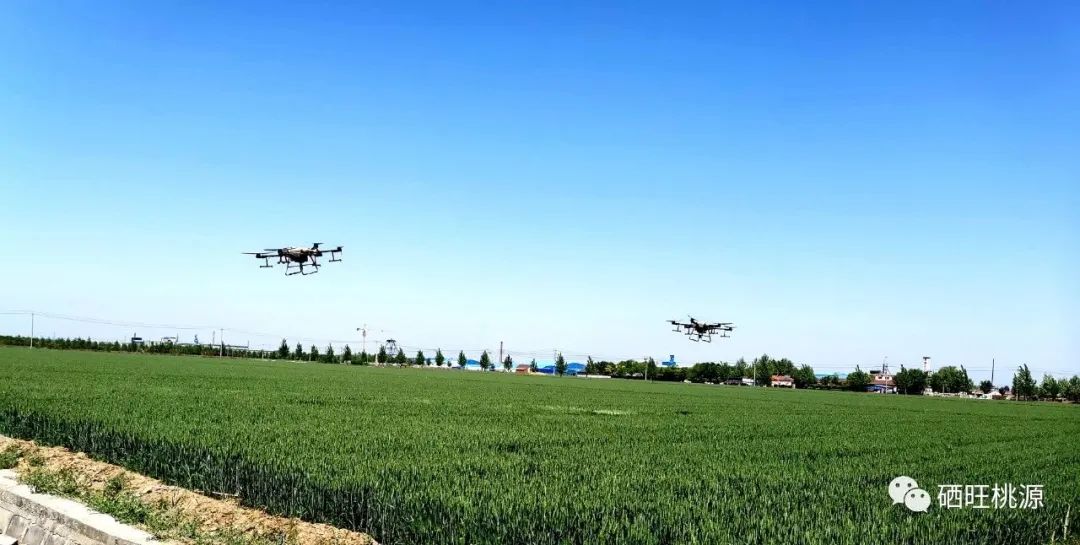 4月26日9時,顏送貴研究員、閔正富總經(jīng)理、弘祥公司董事長常向玉、副總經(jīng)理付玉柱、淄博臨淄區(qū)委書記劉正軍,親臨弘祥農(nóng)業(yè)有限公司西召村基地指導(dǎo)無人機噴施。550畝高硒小麥區(qū)噴施“糧食作物專用C型”(糧油節(jié)力高硒型)富硒葉面肥;5畝多礦物質(zhì)營養(yǎng)小麥區(qū)噴施“糧食作物專用E型”葉面肥。下午3時施硒結(jié)束;5月4日,湖南省瑞芳農(nóng)業(yè)科技發(fā)展有限公司總經(jīng)理閔正富再次親臨基地,現(xiàn)場指導(dǎo)富硒小麥噴施“糧食作物專用C型”葉面肥;多礦物質(zhì)營養(yǎng)小麥噴施糧食作物專用D型(多功能糧油型)葉面肥;6月5日收獲。由于本產(chǎn)品硒含量嚴(yán)重超標(biāo),加工面粉建議按1:1或1:2(高硒小麥:普通小麥)的比例,混合后加工,硒含量控制在0.5-1mg/kg為佳。
